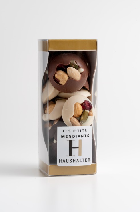 Chocolat noir 63% de cacao minimum (Fèves de cacao pur Pérou, sucre, beurre de cacao, lécithine de tournesol, extrait naturel de vanille), chocolat au lait 40% de cacao minimum (beurre de cacao, LAIT entier en poudre, sucre, fèves de cacao, sucre roux, extrait naturel de vanille, émulsifiant: lécithine de tournesol, extrait de malt d’ORGE), chocolat blanc 35% (beurre de cacao, sucre, LAIT entier en poudre, LAIT écrémé en poudre, lactoserum (LAIT), beurre (LAIT), émulsifiant: lécithine de Tournesol, extrait naturel de vanille) et blanc 33% de beurre de cacao minimum (beurre de cacao, LAIT entier en poudre, sucre, émulsifiant: lécithine de SOJA, extrait naturel de vanille), AMANDES, NOISETTES, PISTACHES (FRUITS À COQUE), pignons de pin, cranberries.