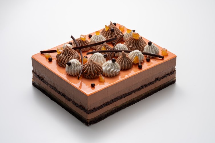Association délicate entre une mousse au thé Earl Grey et un crémeux au chocolat au lait Valrhona 46%, sur un biscuit gourmand au chocolat, recouvert de fines feuilles de chocolat au lait Bahibé 46% et d’une compotée à  l’orange.