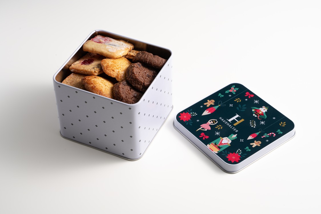 Une douzaine de références sont proposées dans cet assortiment, du traditionnel butterbredele « biscuit au beurre », à l’étoile cannelle plus sophistiquée et moelleuse, découvrez notre gamme à travers cette boîte métal réutilisable, au design raffiné et inspiré du célèbre conte de Casse-Noisette.