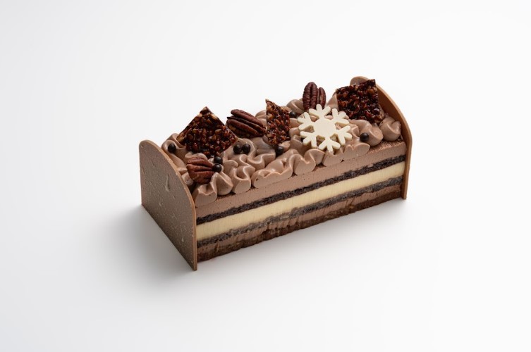 Décors : perles craquantes au chocolat blanc (GLUTEN, LAIT), NOIX DE PÉCAN, nougatine (FRUITS À COQUE) .