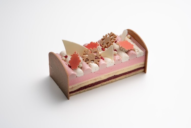 Accord séduisant entre une mousse à la pêche de vigne et un confit de framboises, sur un biscuit croustillant façon shortbread et un biscuit moelleux aux amandes.