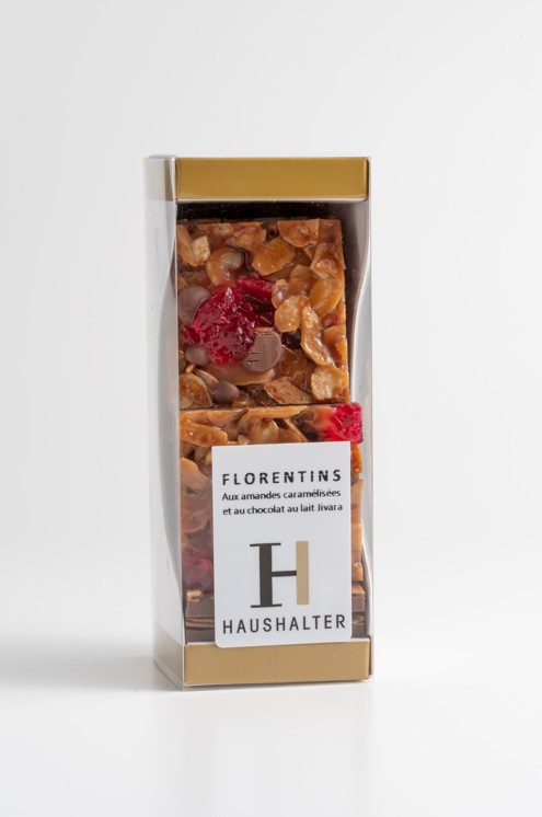 Chocolat noir 63% de cacao minimum (Fèves de cacao pur Pérou, sucre, beurre de cacao, lécithine de tournesol, extrait naturel de vanille), sucre, sirop de glucose, amandes effilées (FRUITS A COQUE), bigarreaux confits, matière grasse végétale, dextrose, lait écrémé en poudre (LAIT), miel, lécithine de SOJA, crème (LAIT).