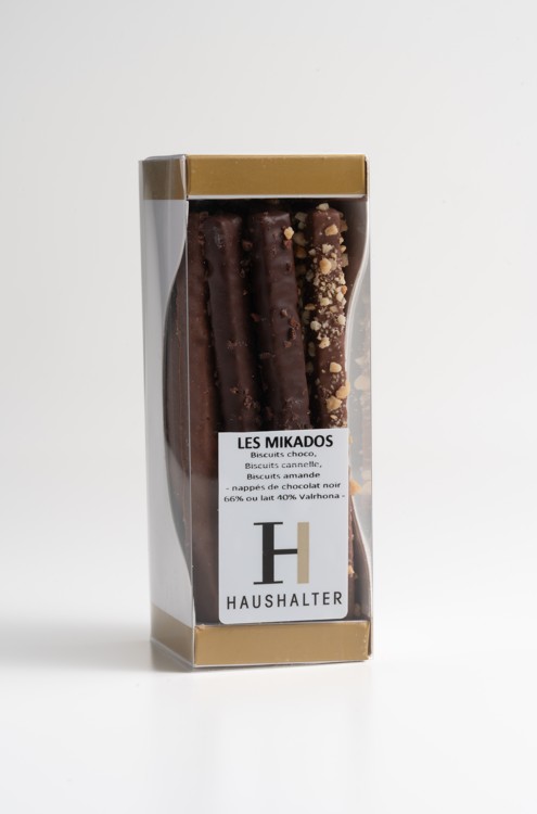 Bâtonnets de pâte sucrée aux amandes enrobés de chocolats noir, lait et blanc.