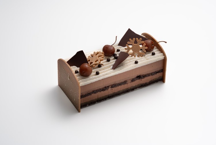 Biscuit façon pim’s griotte, recouvert d’un crémeux intense au chocolat noir Valrhona 66%, de fines feuilles craquantes au chocolat noir Valrhona 66%, et d’une mousse gourmande au mascarpone et éclats de griottes.