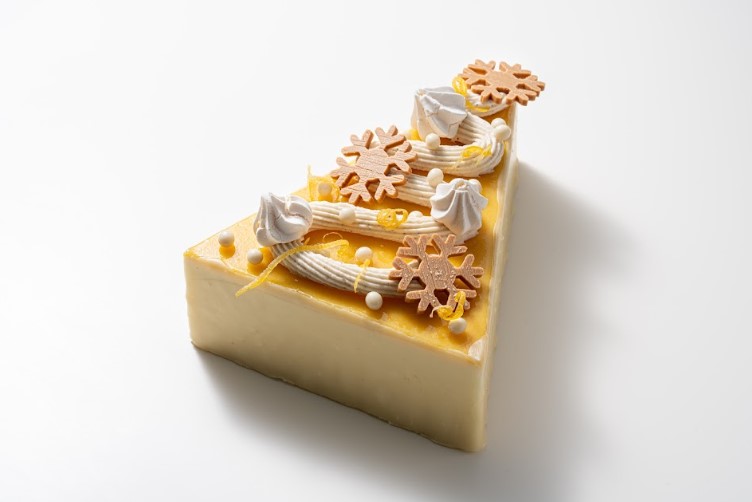 Association tout en fraîcheur autours de 5 sorbets plein fruit : mandarine, citron, framboise, fraise et pêche de vigne, disposés sur une dacquoise aux amandes.